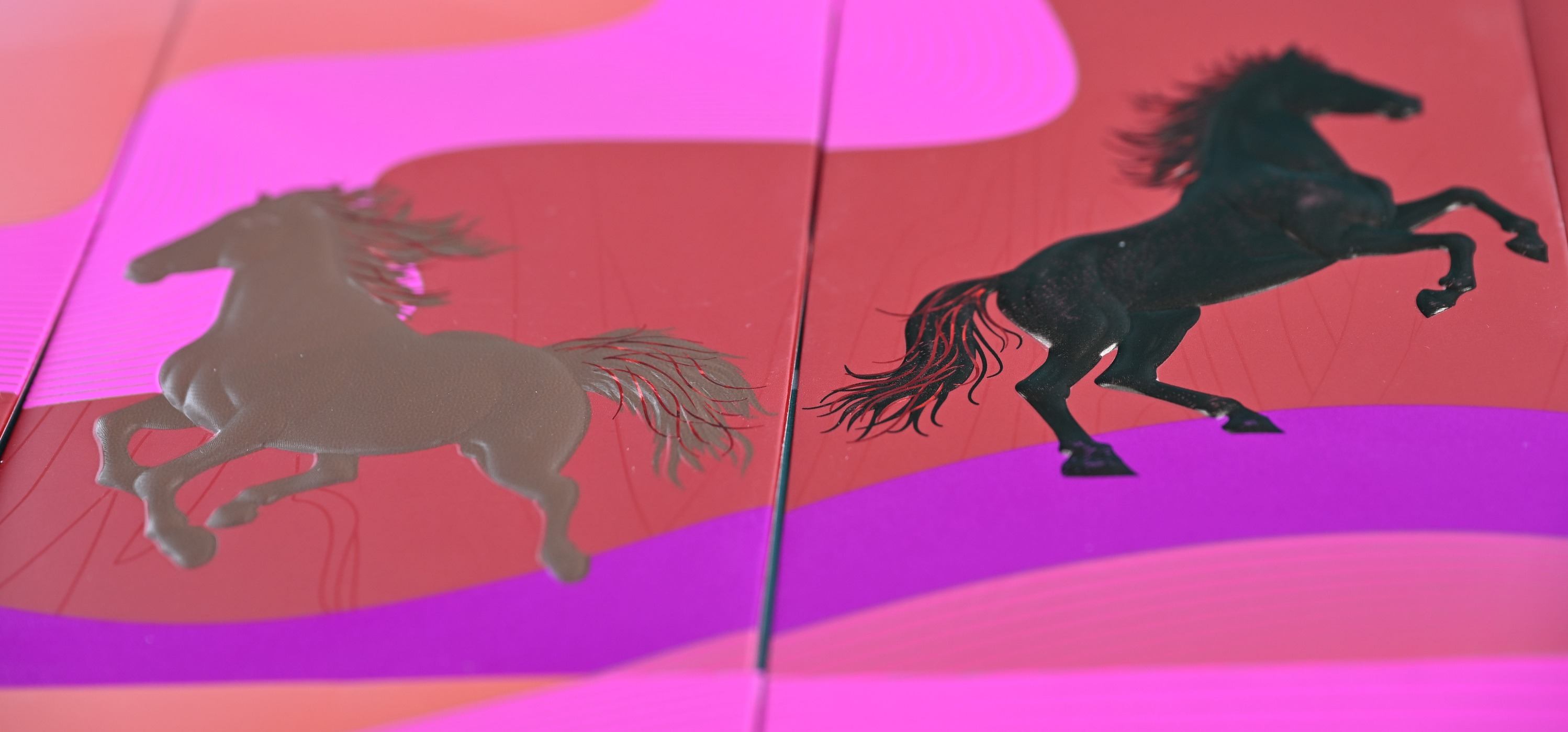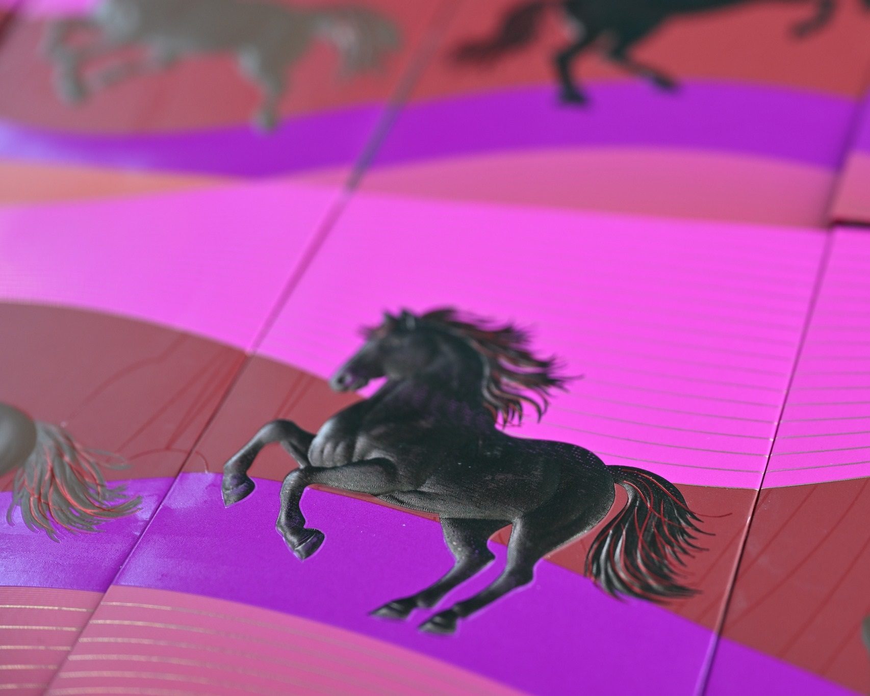 تجذب الصورة الظلية القوية للحصان الانتباه من خلال الانكسار، مما يخلق لمسة نهائية تشبه المرآة تتحول وتلمع مع الحركة. يبرز هذا التلاعب المتطور للضوء الخطوط العضلية والوضعية الديناميكية للحصان المربي، مما يجسد القوة والسرعة والزخم إلى الأمام. تسلط اللمسة المذهلة للرقائق القرمزية الضوء على عرف والذيل المتدفق، مما يضيف ازدهارًا دراميًا باللون الأحمر الميمون الذي يرمز إلى العاطفة والحيوية والحظ السعيد. كل التفاصيل تستحق الإعجاب.